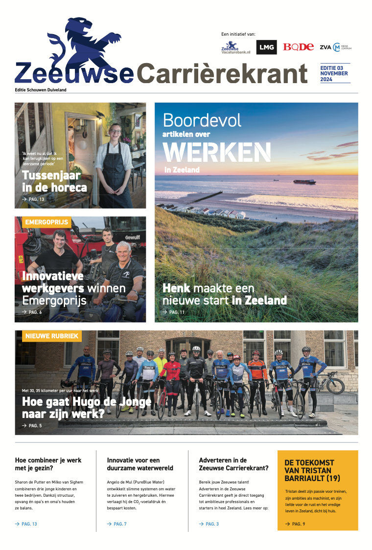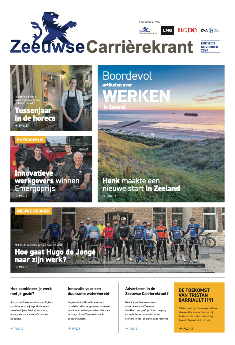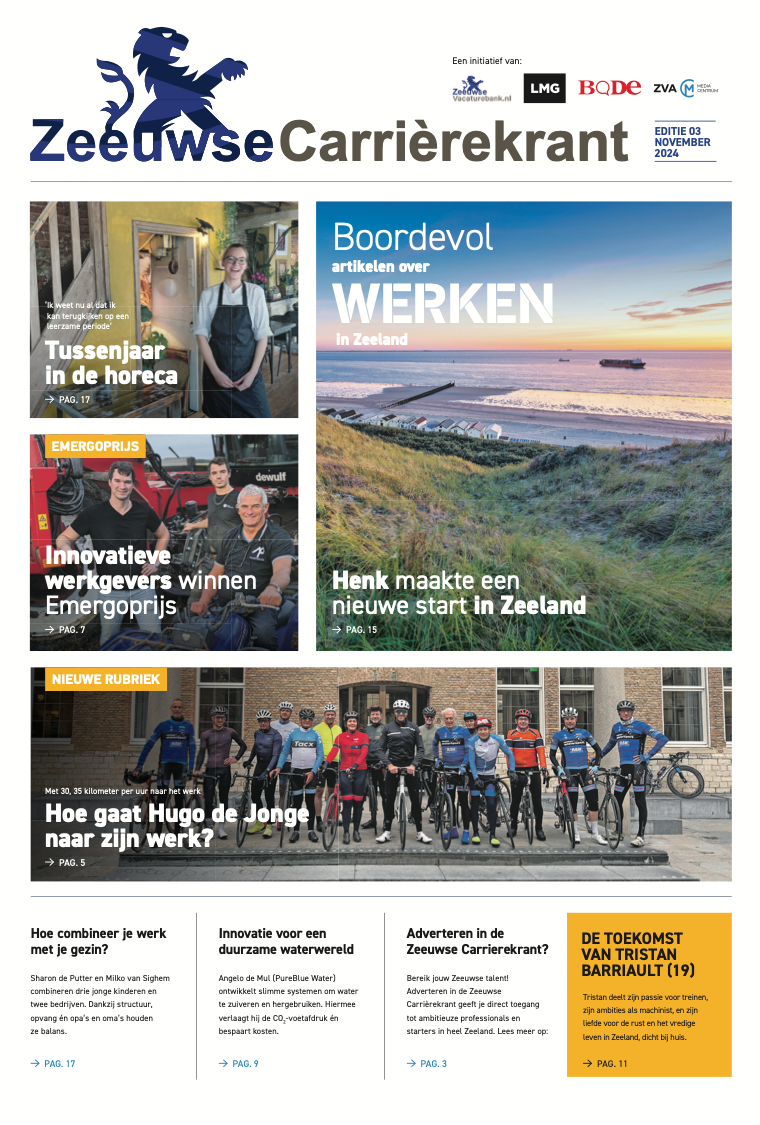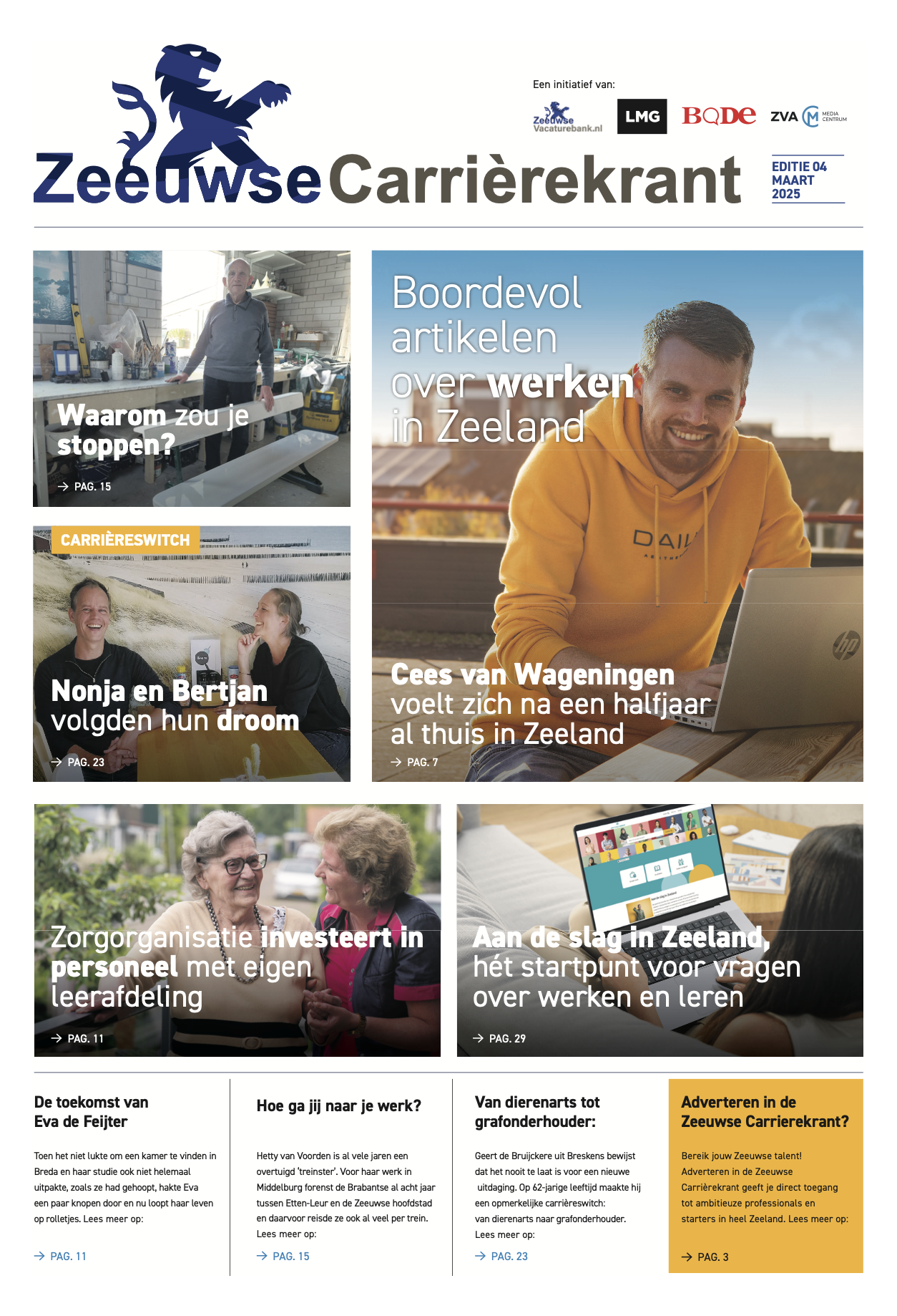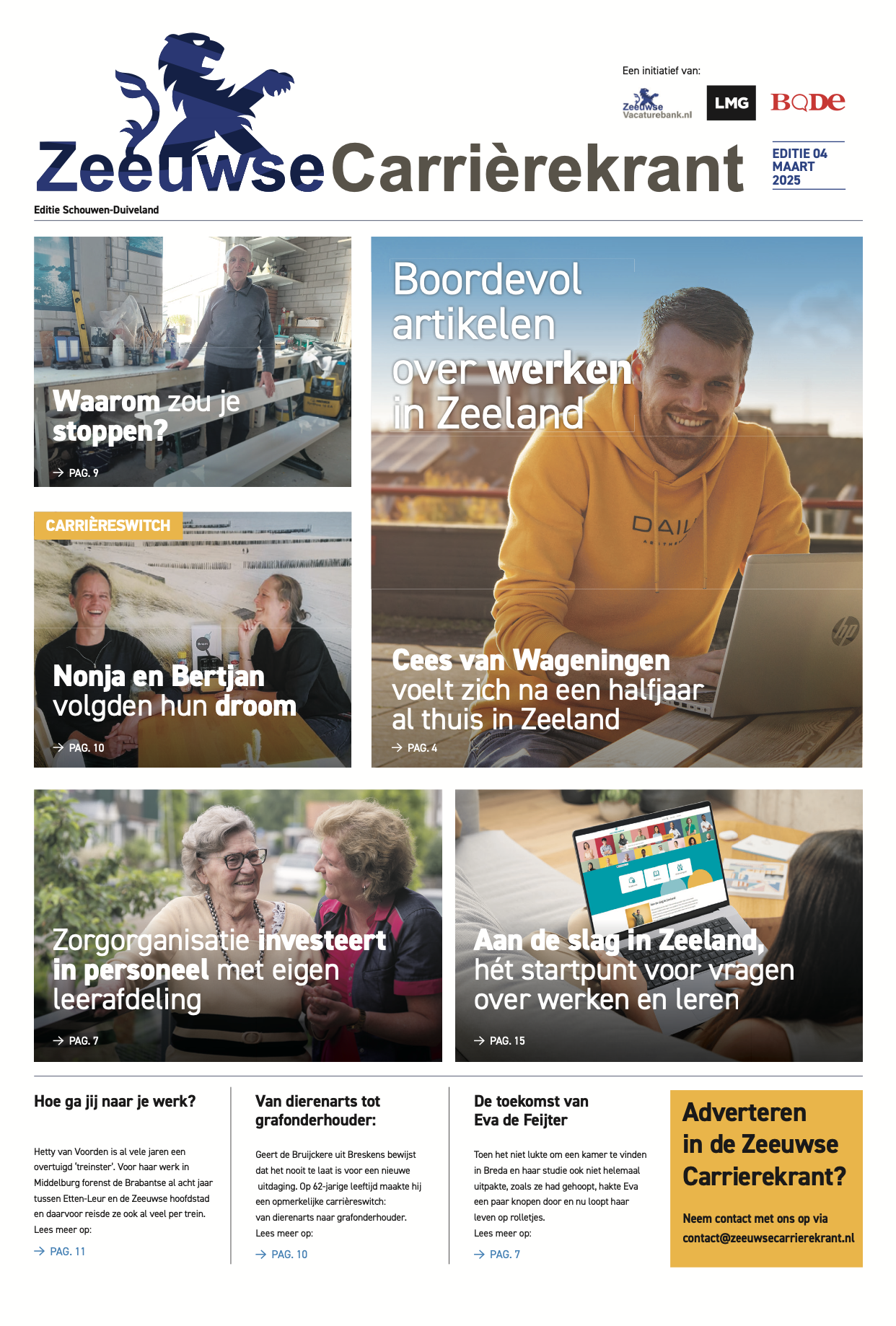 De Zeeuwse Carrièrekrant is meer dan een vacaturekrant. Het is een huis-aan-huis krant met Zeeuwse verhalen over werken, werkgevers, achtergronden, carrière en natuurlijk vacatures. Vier keer per jaar gratis op de mat in heel Zeeland én westelijk Brabant. En hier ook digitaal te lezen.